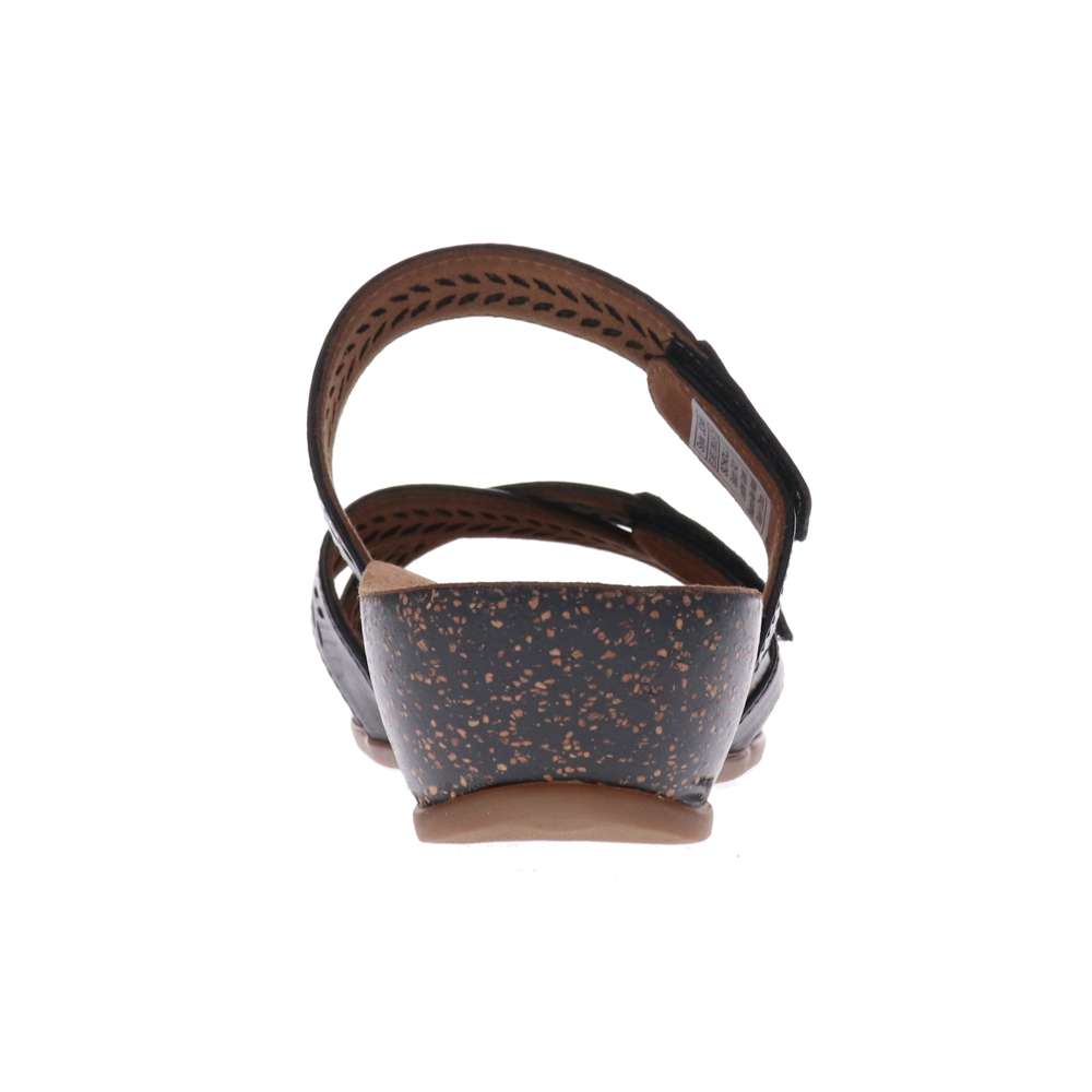 Joan with it's 2 points of hook and loop adjustability and punch detailed makes this leather mule the perfect fit for even the hardest to fit feet . The super light weight wedge unit makes this an ideal shoe to wear all day . The Podiatrist designed Orthaheel footbed is built into the wedge keeping the unit slimline with out compromising the fit or comfort .Leather wedged crossover vamp mule with laser punching detailHook and loop strap entry for better fit and adjustabilityCork covered 30 cm light weight wedgeRubber OutsoleWedge unit incorporates a fully moulded podiatrist designed footbed for all day comfort and support